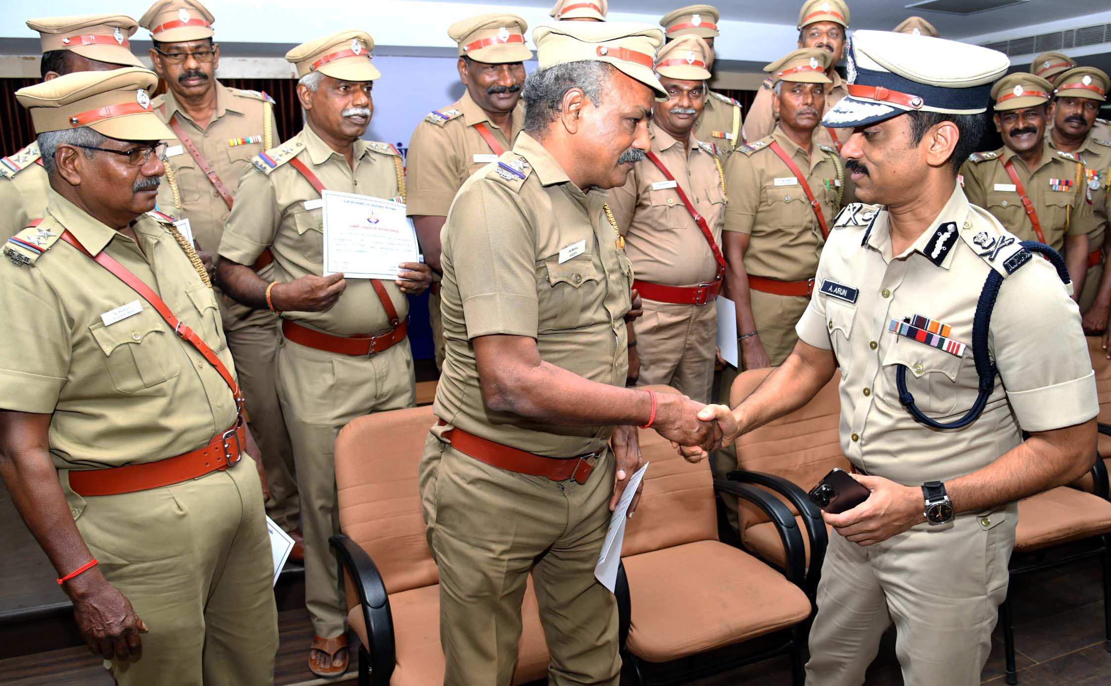 சென்னை பெருநகர காவல் ஆணையரகத்தில் நடைபெற்ற 24 காவல் அதிகாரிகள் மற்றும் ஆளிநர்களின் பணி நிறைவு விழாவில், சென்னை பெருநகர காவல் ஆணையாளர் கலந்து கொண்டு காவல் துறையினரின் பணியை பாராட்டி சான்றிதழ்கள் வழங்கினார்.